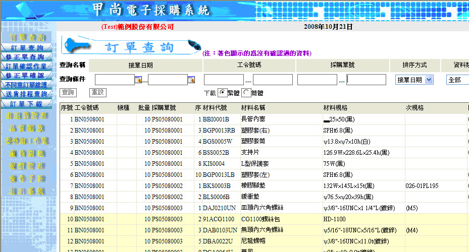 作業目的: 在功能選單中點擊「訂單查詢」後,則進入訂單查詢作業,如下圖。